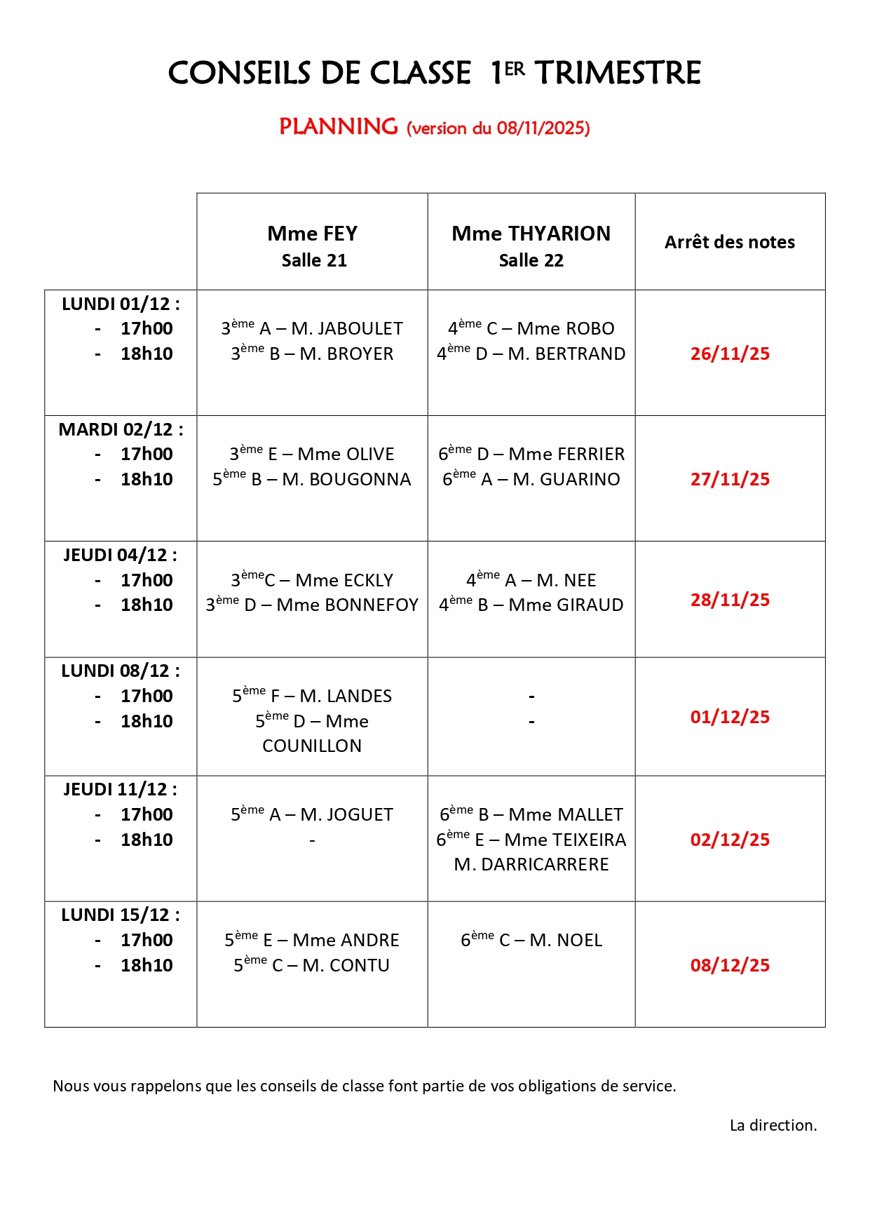 Planning conseil de classe 1er trimestre